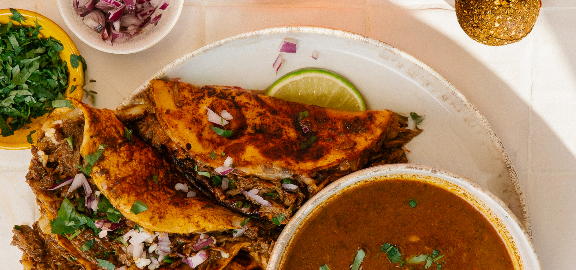 Dip the tortillas in the broth, add the shredded meat and cheese, and fry the tacos until golden brown. Serve with broth, fresh cilantro and onion.